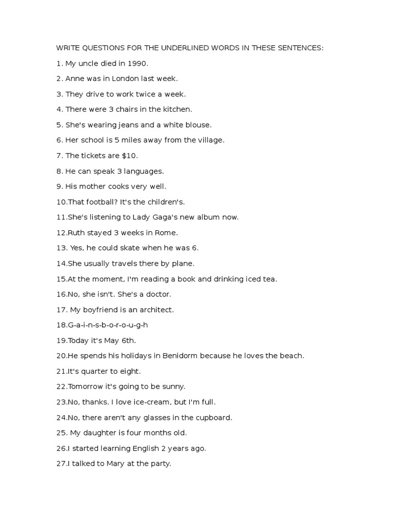 Write Questions For The Underlined Words In These Sentences Pdf